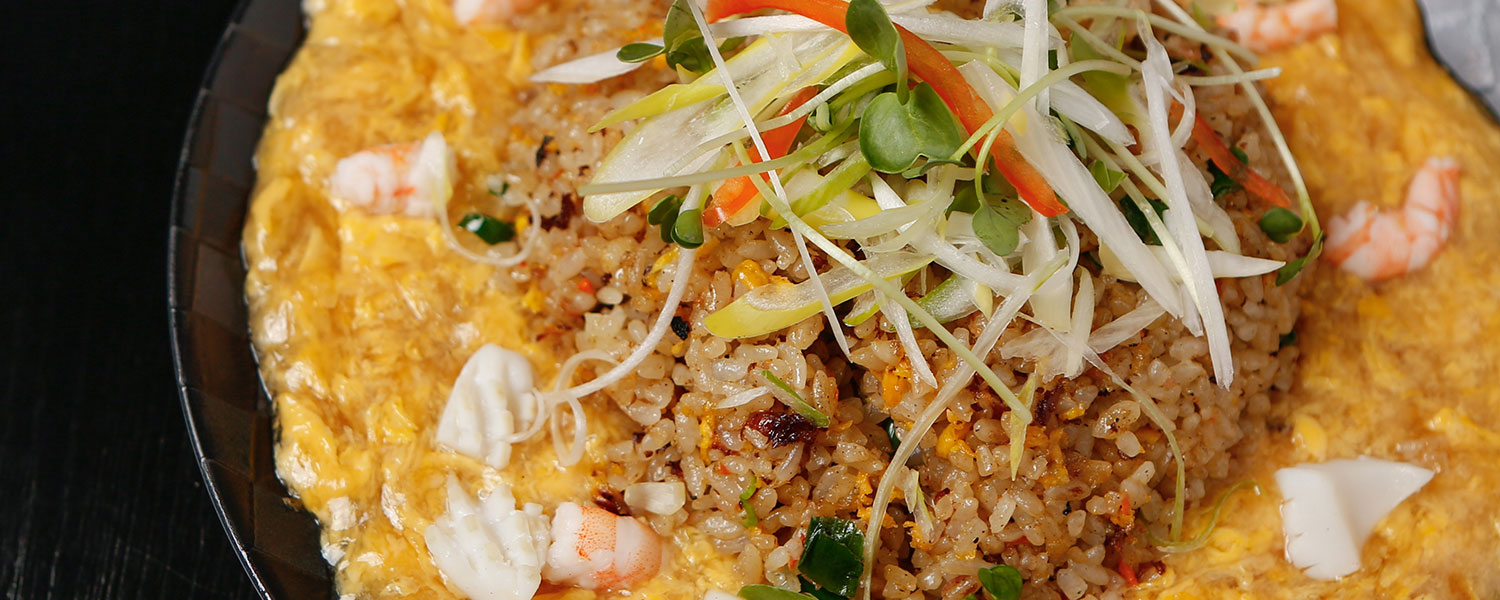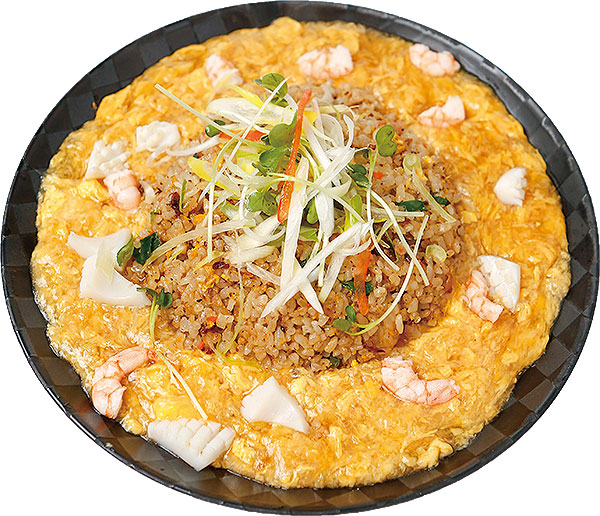オイスターソースで味付けした玉子タップリあんの上に炒飯を盛り付け、エビとイカをトッピングしました。