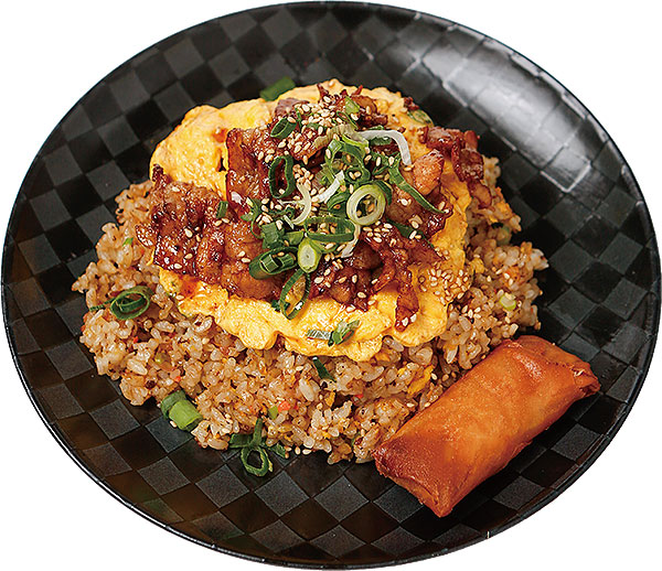 チャーハンに玉子焼きとホルモンダレで炒めた豚バラをトッピングし、パリパリの春巻きを添えました。オススメです!